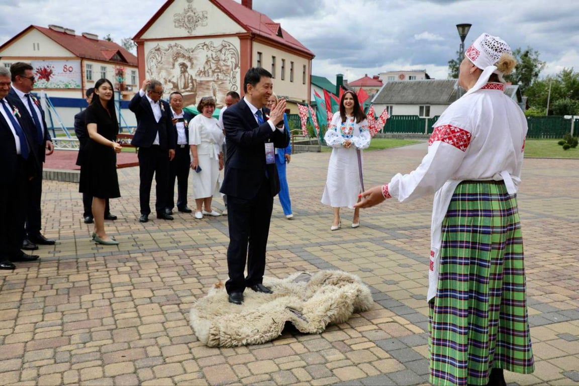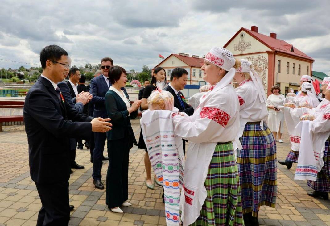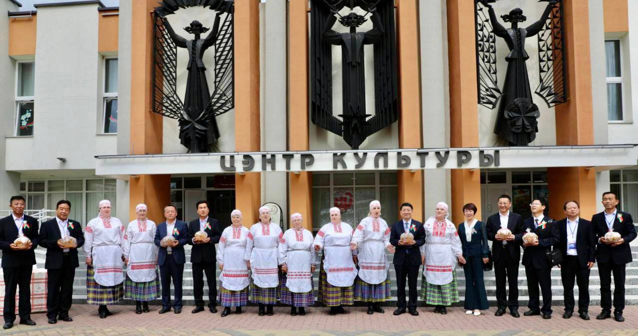 Участницы народного фольклорного коллектива “Чараўніцы-каравайніцы” встретили членов делегации из Китайской Народной Республики обрядовым приветствием и вручили им Слонимские гостевые караваи, сообщается на канале "Культура Слонимщины".