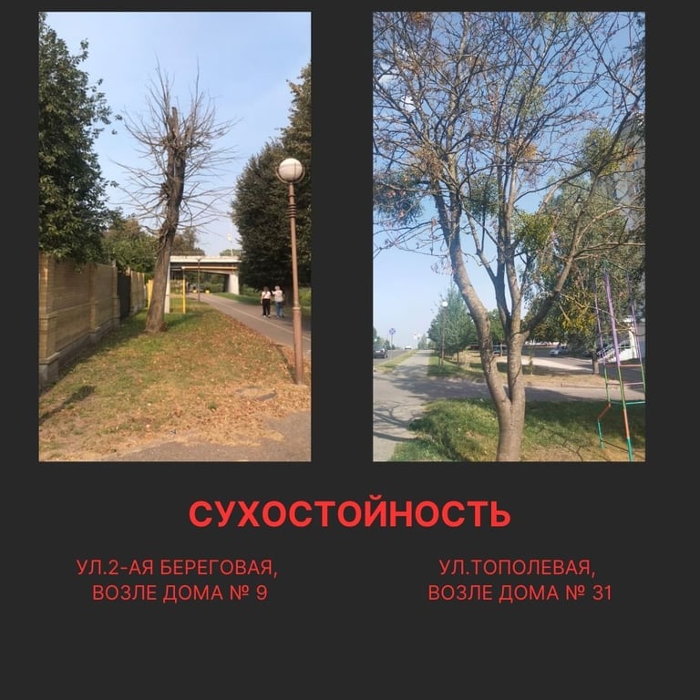 Сухие деревья будут спилены возле дома №9 на ул. 2-й Береговой и дома №31 на ул. Тополевой.
