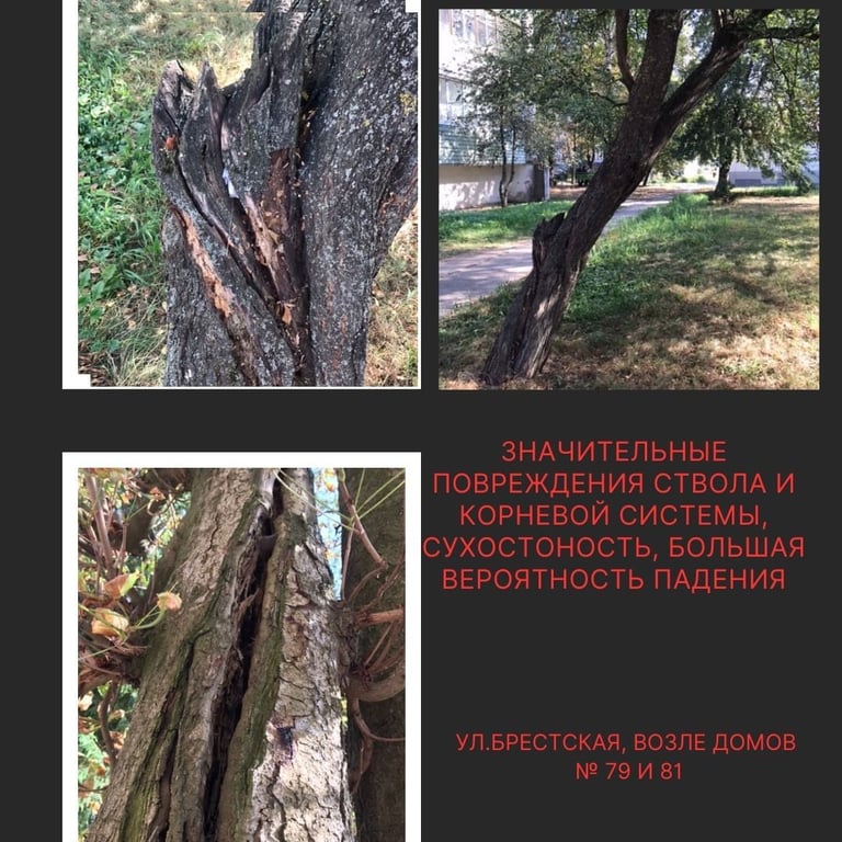 Уберут деревья и возле домов №79 и 81 на ул. Брестской. У них значительные повреждения ствола и корневой системы, сухостойность и большая вероятность падения.
