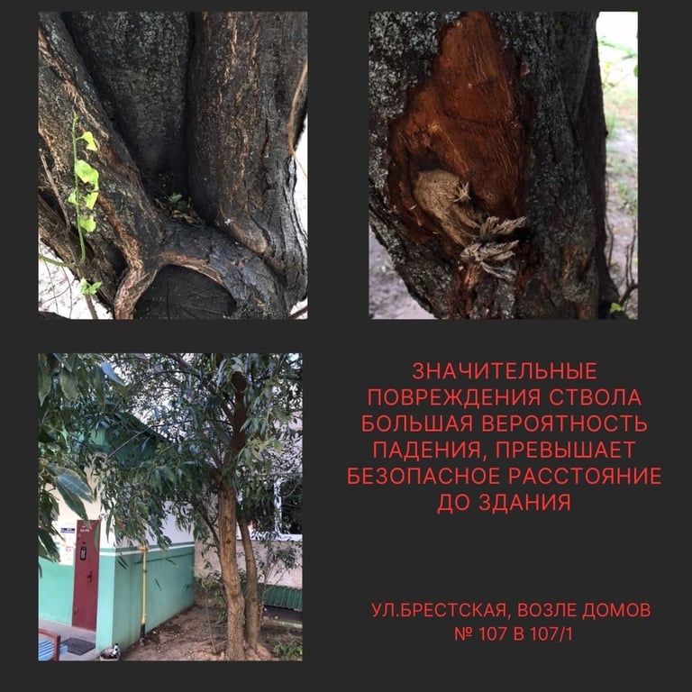 Удалят деревья возле домов №107В и №107/1 на ул. Брестской. Основание для удаления — значительные повреждения ствола, большая вероятность падения. Также деревья превышают безопасное расстояние до здания.