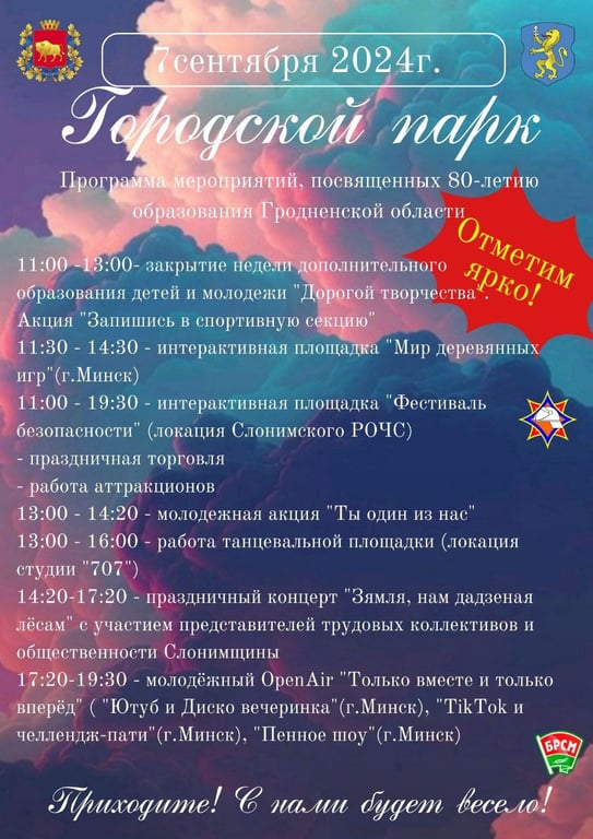 В городском парке Слонима 7 сентября пройдут мероприятия, посвященные 80-летию со дня образования Гродненской области.