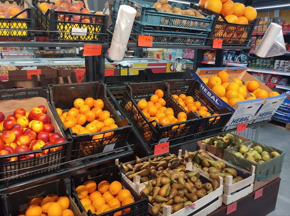 В торговом центре на огромной площади расположился крупный дискаунтер «Маяк». Мы изучили цены на мясные продукты, а также на фрукты и овощи, которые представлены в магазине.
