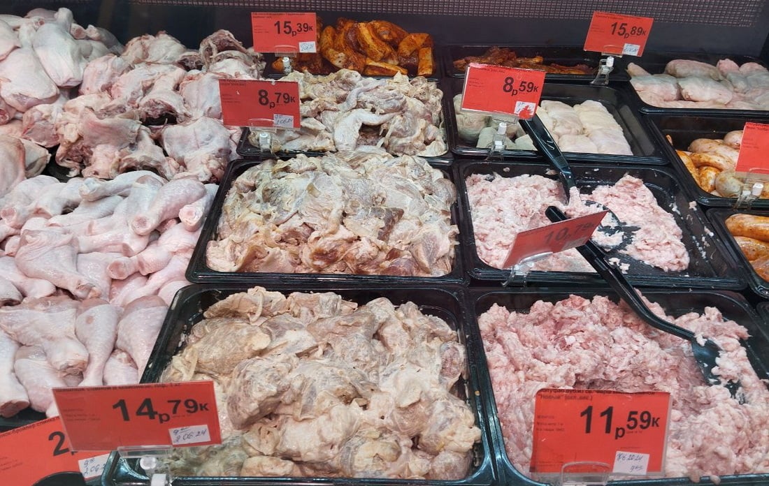 Полуфабрикат свиной для тушения стоит 17,99 руб., полендвица – 17,59 руб., тазобедренная часть – 12,99 руб., грудинка для запекания – 11,59 руб., свинина на кости – 8,99 руб., филе индейки – 15,99 руб., куриное филе – 13,04, бедро цыпленка – 8,63 руб., голень – 6,89 руб., цыпленок бройлера – 8,57 руб., фарш – 12,79 руб., 11,59 руб., 10,79 руб., колбаски – 8,59 руб., 12,79 руб.
