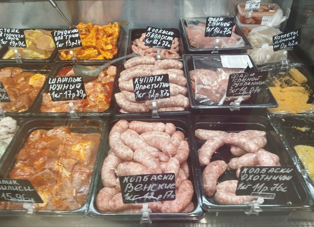 Затем мы заглянули в магазин местного мясокомбината. По словам продавцов, цены на мясную продукцию здесь такие же, как и в других магазинах этого производителя. Например, полендвица стоит 21,46 руб., свинина на кости – 8,90 руб., шейная часть – 18,88 руб., шашлык – 16,36 руб., фарш – 11,07 руб., 14,75 руб., колбаски – 11,76 руб., 12,87 руб., 16,87 руб., шашлык – 15,96 руб., 17,89 руб.