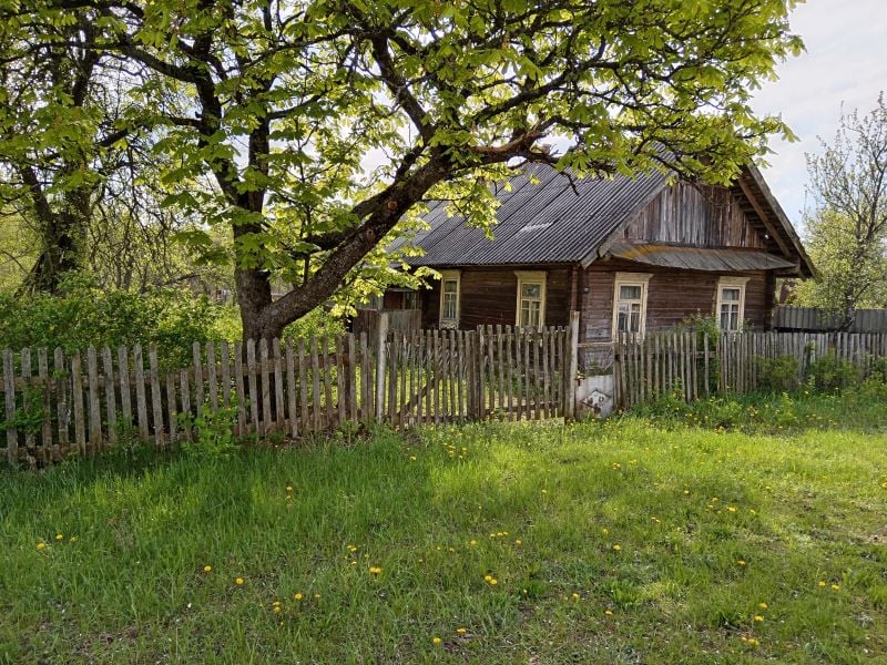 Есть какой-никакой деревянный забор из штакетника. Сам домик — типичная деревенская изба, сложенная из бревен. Место это тихое и живописное, лес находится сразу за огородами.