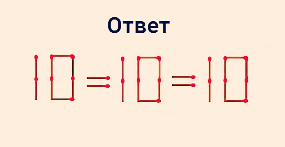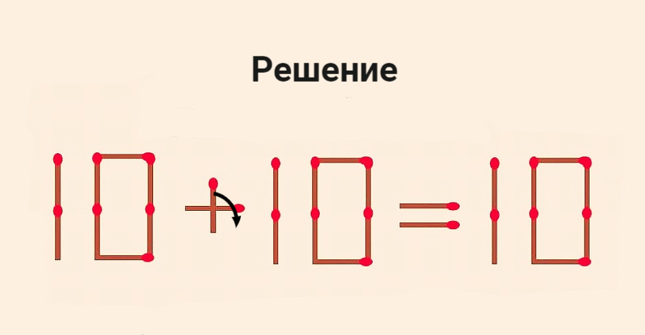 Вам нет равных в сообразительности, если за 10 секунд переложите 1 спичку в примере 10+10=10
