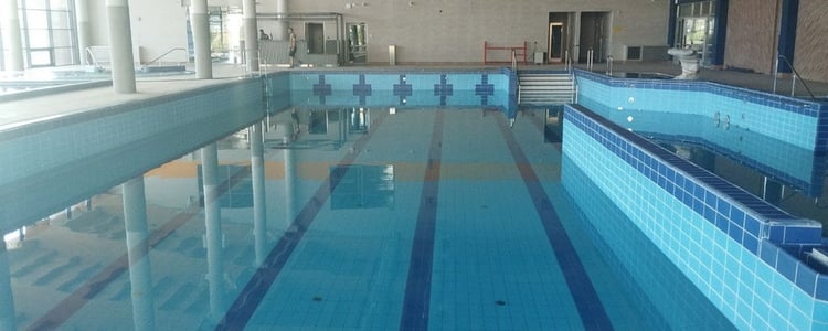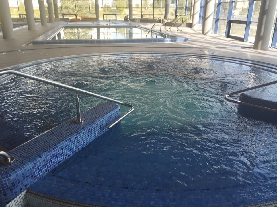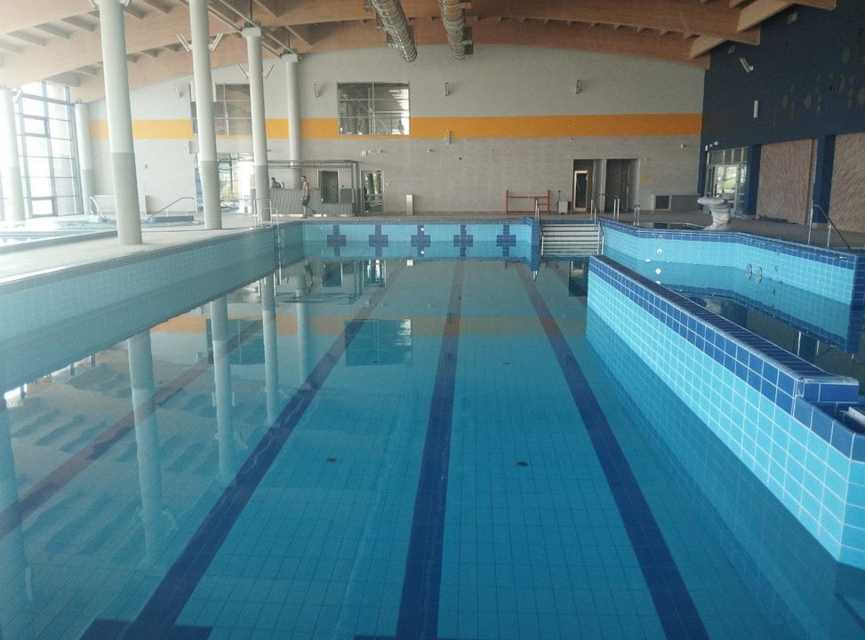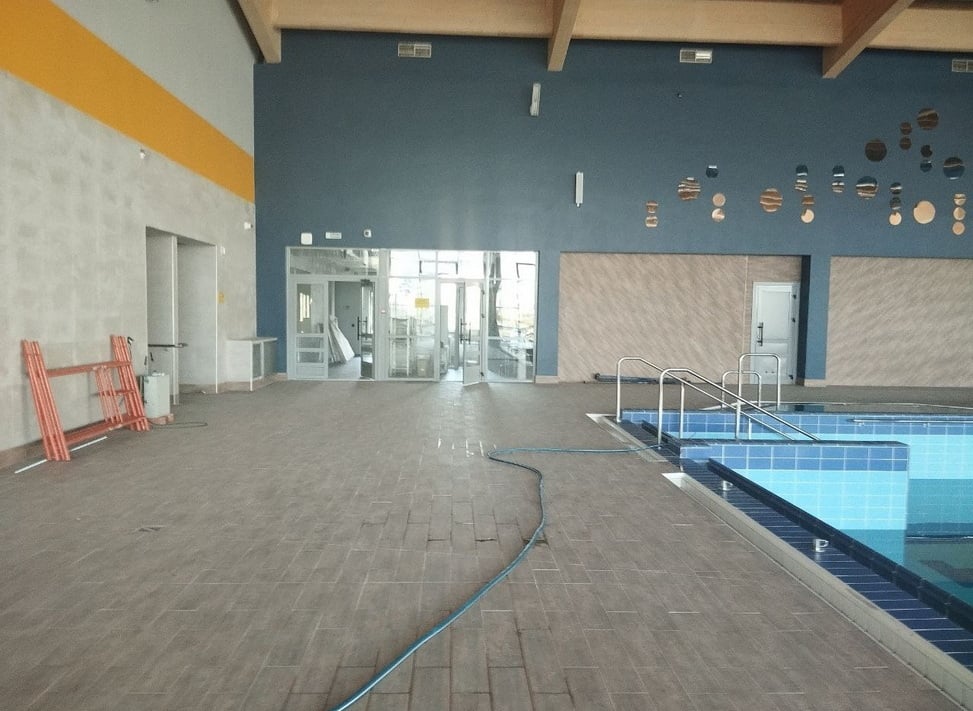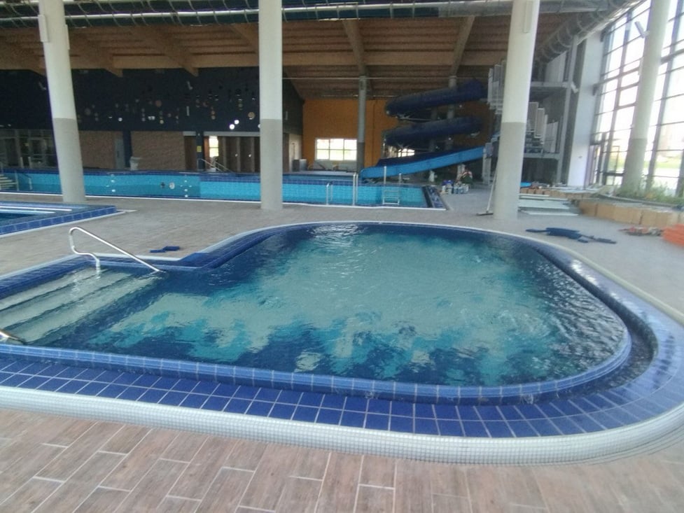 Физкультурно-оздоровительный комплекс "Щара" в Слониме готовится к открытию: бассейны и джакузи уже заполняются водой, проводится промывка системы. Вода в джакузи бурлит, ускоряя ритм подготовки.