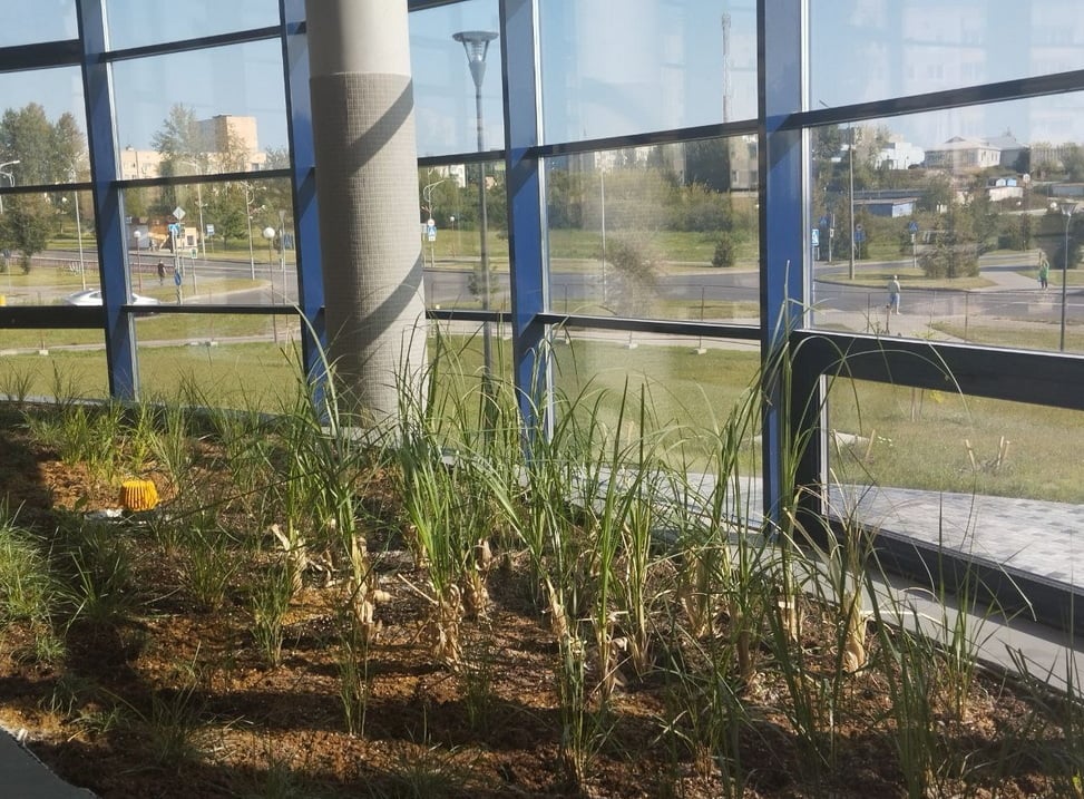 В новом физкультурно-оздоровительном комплексе в Слониме у панорамных окон находится две клумбы. Одна из них усажена зеленью, а вторая напоминает пруд. Дно водоема аккуратно выложено натуральными камушками. На поверхности воды плавают кувшинки, придавая композиции живописность и природную красоту. Панорамные окна пропускают много света, который отражается в воде, что делает уголок уютным и приносит умиротворение.