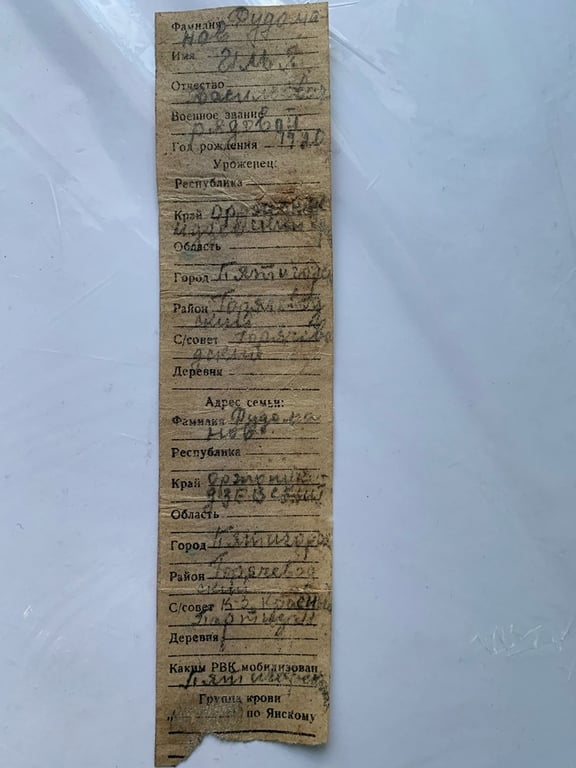 В одном из медальонов вкладыш истлел полностью. Во втором медальоне вкладыш сохранился хорошо. Установленные данные: «Рудоманов Илья Васильевич, 1920 г.р. Уроженец: Орджоникидзевский край, г. Пятигорск, Горячеводский район, Горячеводский сельсовет. Адрес семьи: Рудоманов, Орджоникидзевский край, г. Пятигорск, Горячеводский район, Горячеводский сельсовет, колхоз «Красный Партизан».