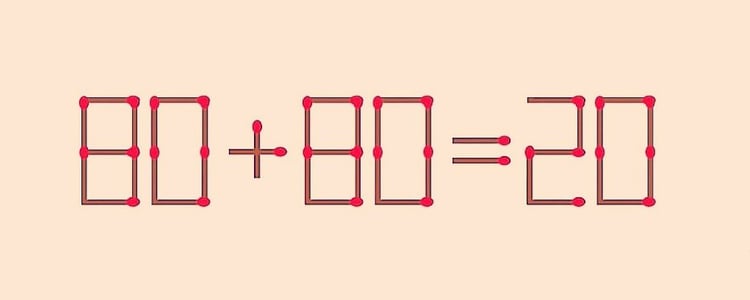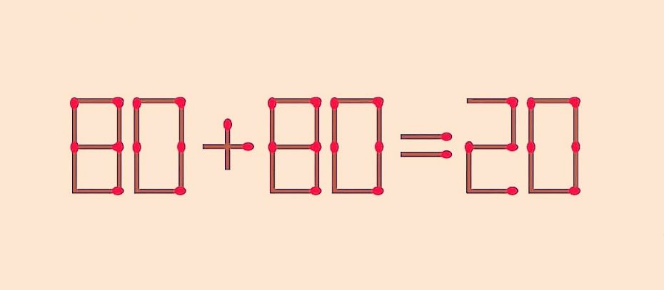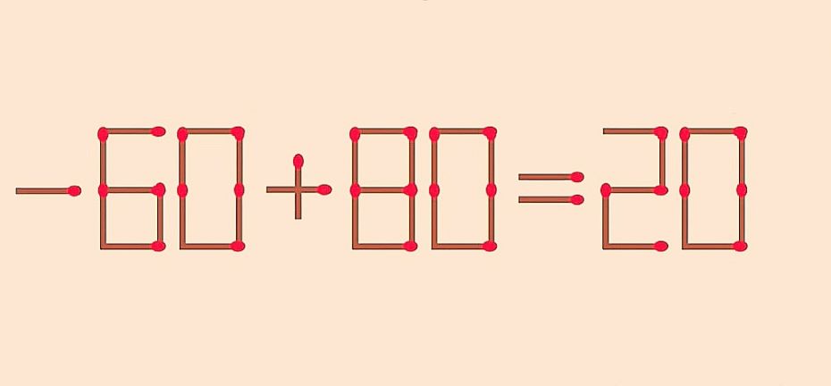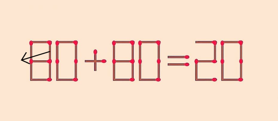 Для решения неверного равенства следует взять спичку у первой цифры 80. Она превратится в 60. А лишняя спичка становится в качестве знака «-«, превращая неверное равенство в верное: –60+80=20.