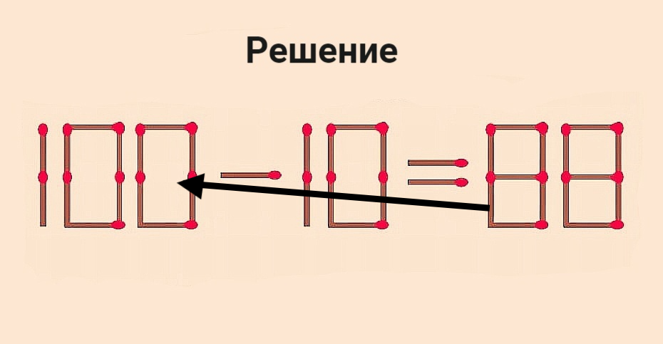 Равенство 100–10=88 не является правильным. Следует переставить в другое место 1 спичку так, чтобы оно стало правильным. Эксперты решают такую задачу менее чем за 20 секунд. Если у вас на поиск ответа уйдет не больше 20 секунд, то вы тоже можете считать себя экспертом в области головоломок. Даже не экспертом, а королем мозговых головоломок!