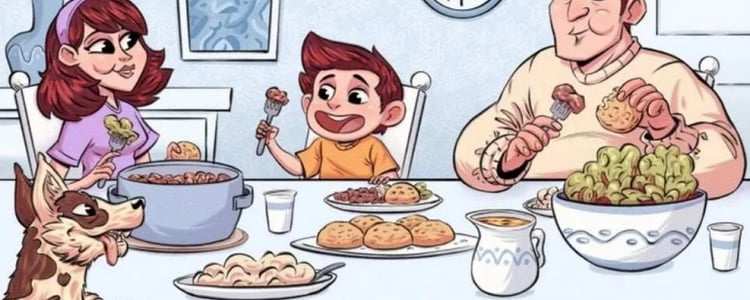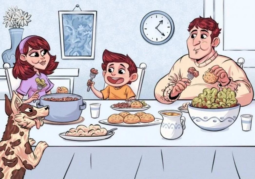 Сегодня ваша задача — найти два спрятанных лица на картине, изображающей сцену семейного ужина. За столом сидят мама, папа и ребенок, а собака наблюдает за ними с интересом. Лица спрятаны настолько искусно, что заметить их можно, только вглядевшись в каждый уголок изображения.