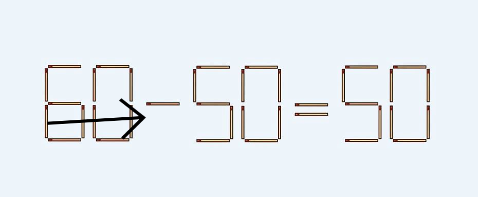 Следует 1 спичку переставить за это время на другое место, чтобы решение 60–50=50 было правильным.
