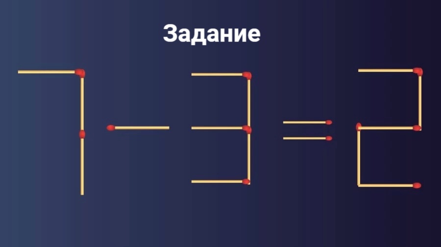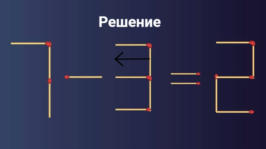 Нужно решить пример 7 — 3 = 2. Для этого следует переставить традиционно только 1 спичку. Если сообразите, как это сделать за 11 секунд, можете смело считать себя великим решателем головоломок.