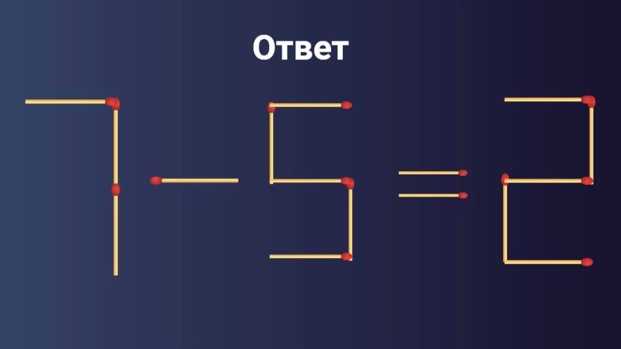 Решение этой головоломки следующее. Цифру 3 превращаем в цифру 5 и получаем ответ: 7 — 5 = 2.