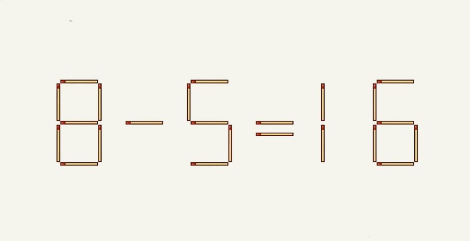 А случилась сегодня интереснейшая головоломка! Разве это не повод обрадоваться и настроиться на приятное времяпрепровождение?! А нужно, как и всегда, переместить 1 спичку. Неверное равенство 8–5=16 должно за 30 секунд превратиться в верное. Поехали?
