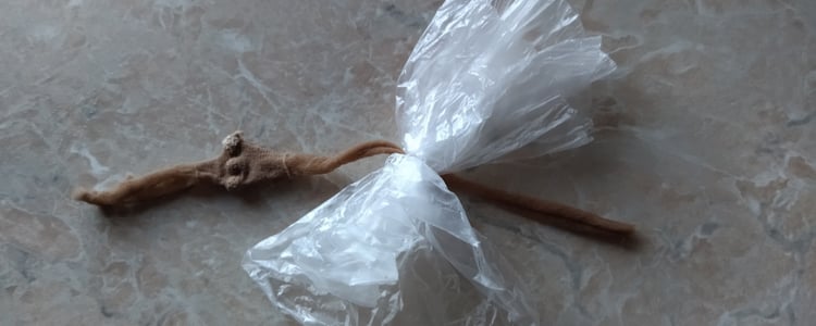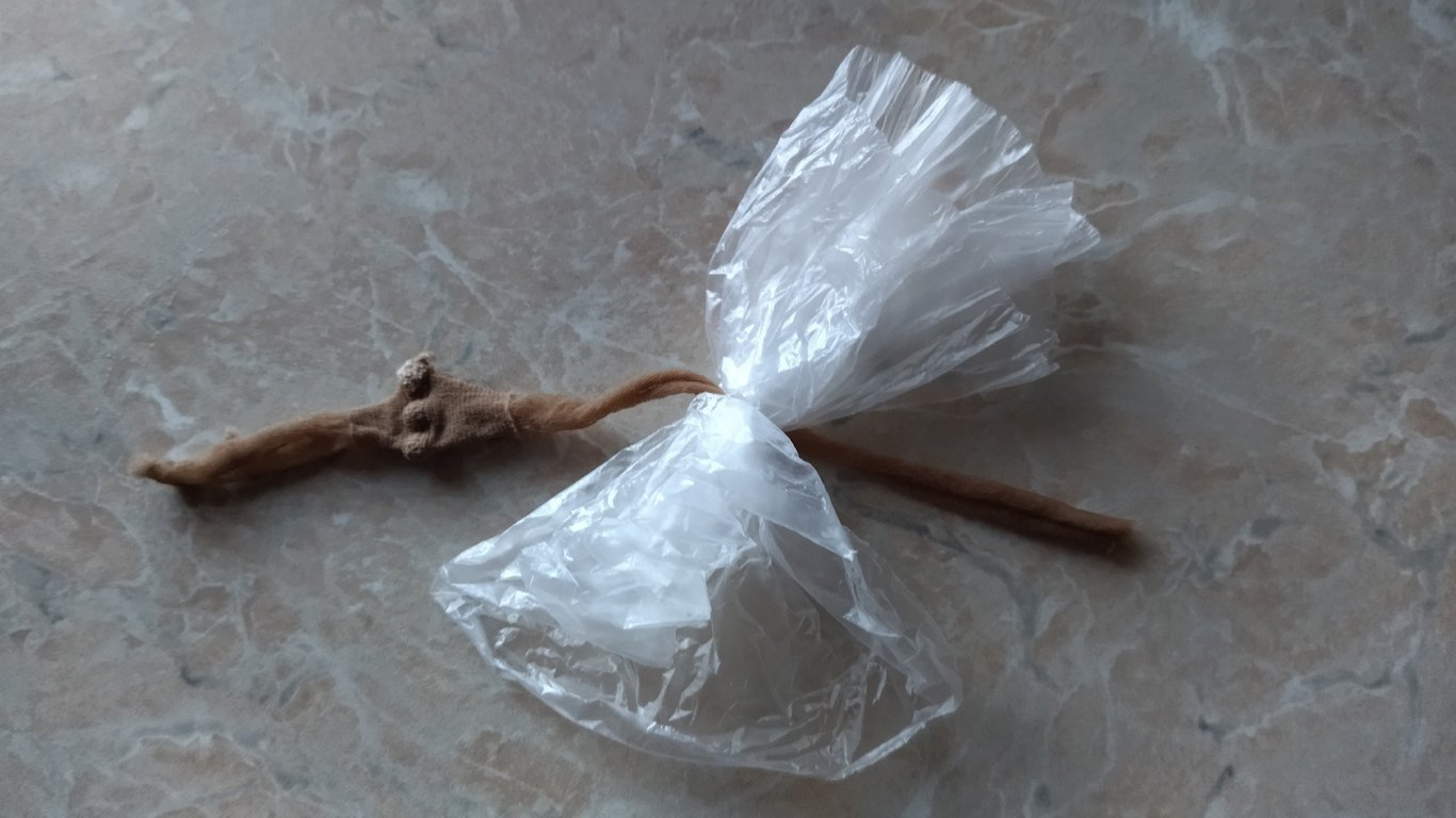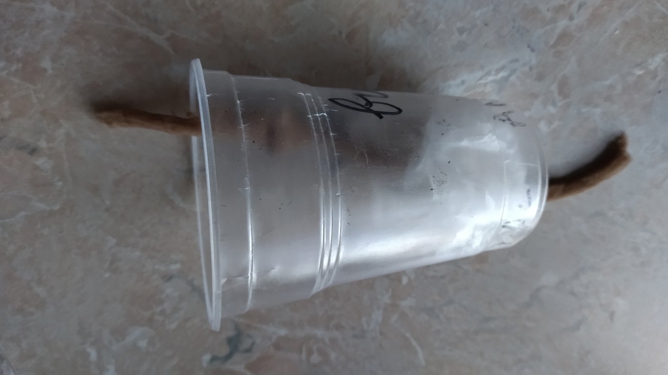 Сделайте небольшое отверстие на дне одного из стаканов и протяните через него веревку, оставив на дне кусочек целлофана как дренаж.