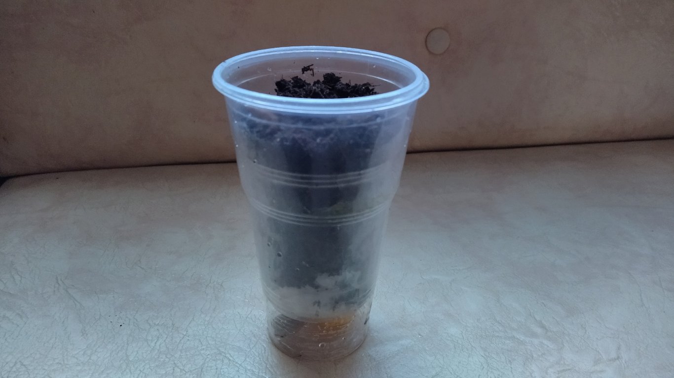 Насыпьте в этот стакан землю так, чтобы веревка слегка торчала из почвы. Посейте семена перца или высадите росток.