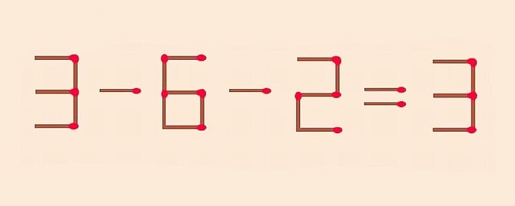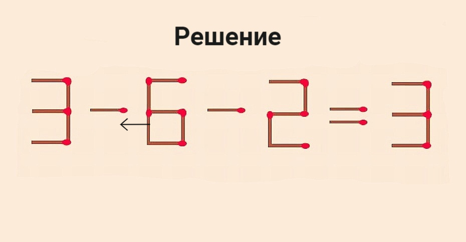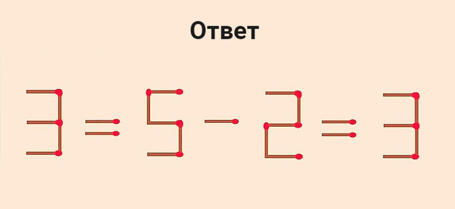 Равенство 3–6–2=3 решено неверно. Переложите в нем 1 спичку на другое место, чтобы сделать его правильным. Если сможете сообразить, как это сделать, менее чем за 20 секунд — у вас необычайно гибкое мышление. Вы не ограничиваетесь привычными рамками и всегда ищете нестандартные способы решения проблем.