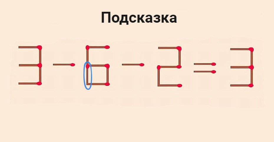 А для тех, у кого мозг стал закипать, даем подсказку: смотрите, какую спичку нужно переложить на другое место. Она обведена кружком. Так что не сдавайтесь и ищите ответ. Вариантов решения с подсказкой стало уже намного меньше.