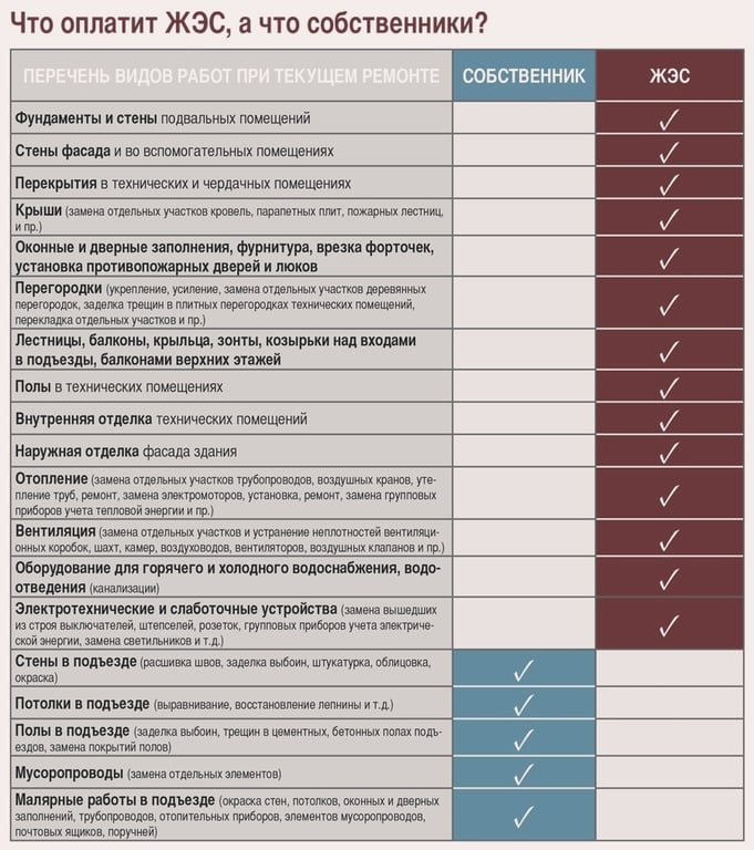 В постановлении «Об утверждении Инструкции о порядке планирования, проведения и финансирования текущего ремонта жилищного фонда и признании утратившим силу постановления Министерства жилищно-коммунального хозяйства Республики Беларусь от 4 июня 2014 года №12» четко разграничиваются виды работ по текущему ремонту, выполняющиеся за счет средств граждан – все они касаются ремонта в подъездах, а также работ, выполняющихся с привлечение бюджетных ассигнований.