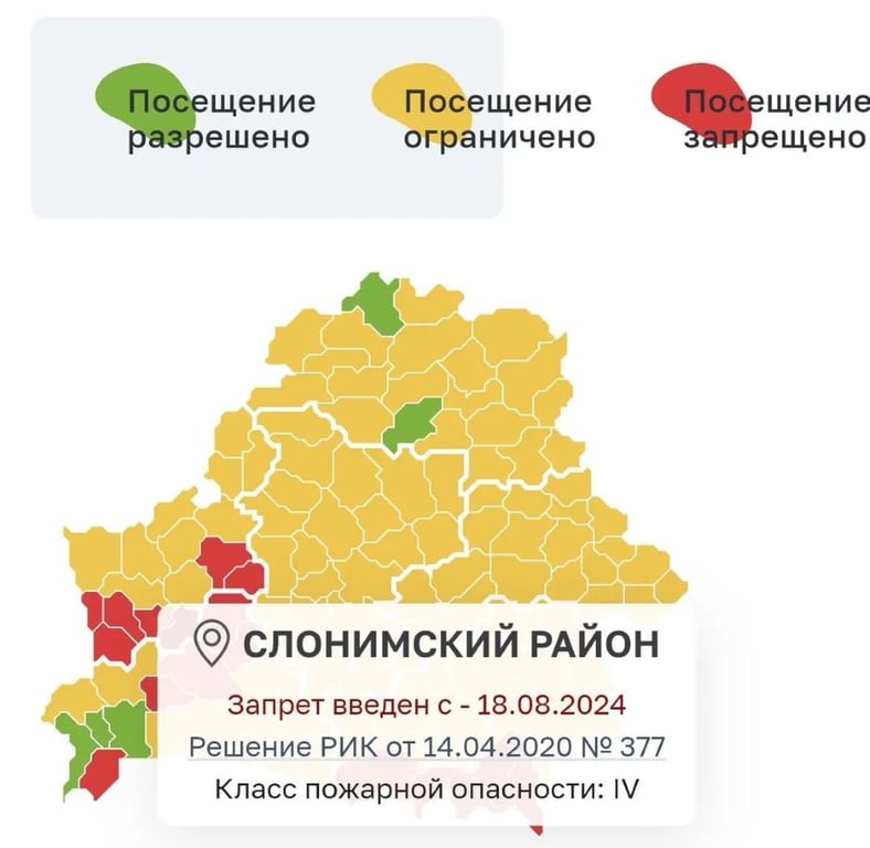 Слонимский лесхоз сообщает, что в связи с установившейся сухой солнечной погодой и сложившимся высоким классом пожарной опасности на территории гослесфонда Слонимского и Зельвенского районов в целях сохранения пожарной безопасности с 18 августа вводится запрет на посещение лесов гражданами.