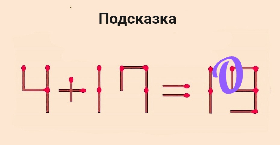 Для тех, кто запутался в цифрах, обещанная подсказочка. Мы обозначили спичку, которая требует перестановки. Подумайте, куда ее нужно пристроить.